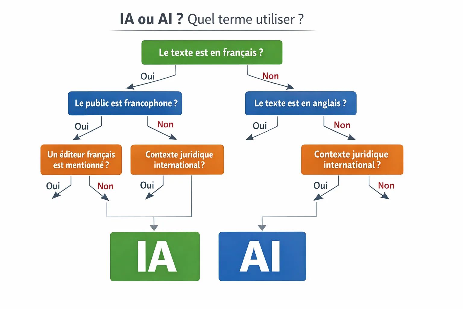 Dans un contexte francophone, IA renvoie immédiatement à intelligence artificielle, à la réglementation et aux institutions locales. En contexte global, AI est la convention dominante portée par les fournisseurs, la documentation technique et les communautés dev.