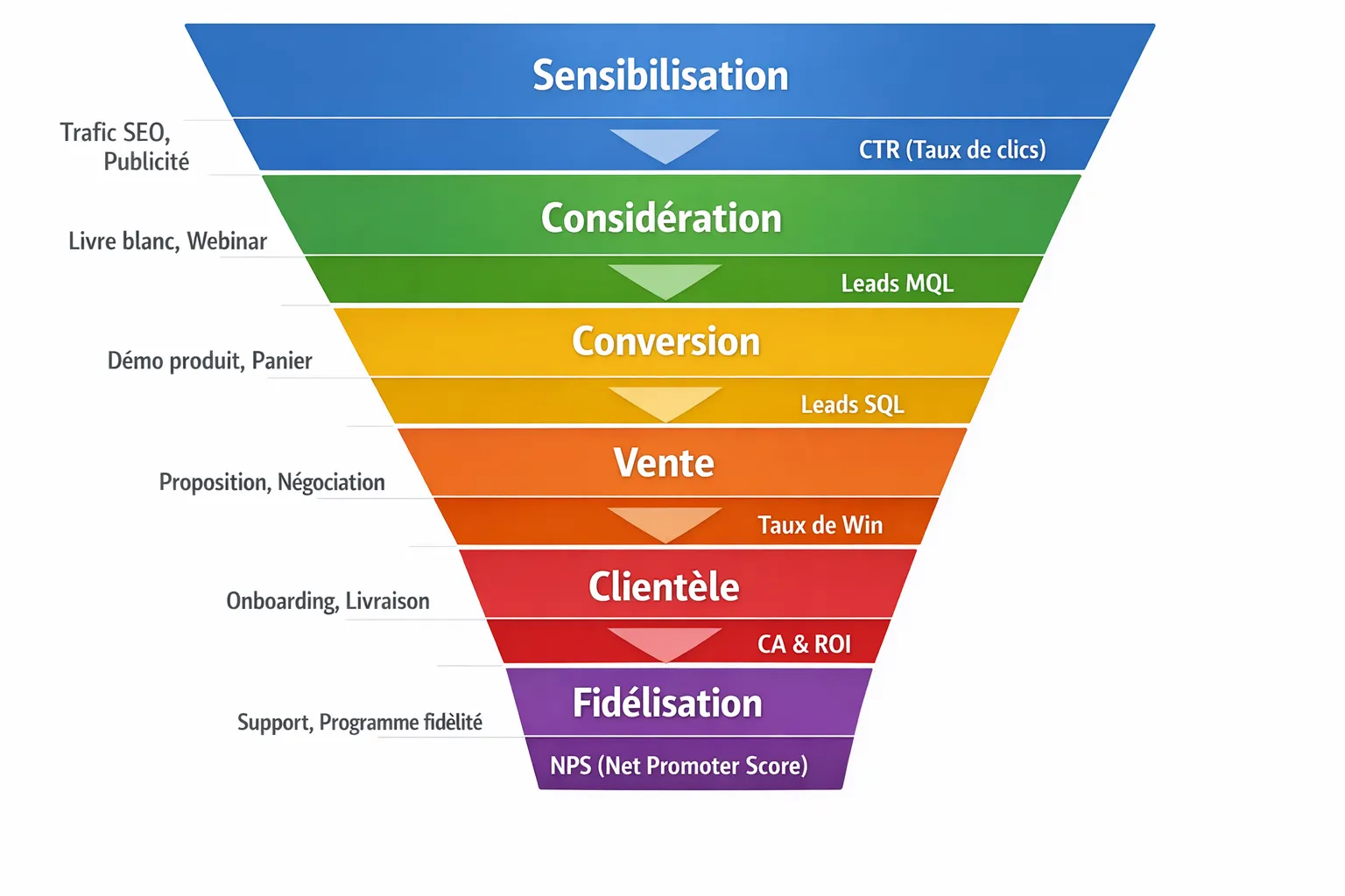 The sales funnel describes the steps traversed by an audience, from discovering your offer to purchasing, then loyalty. It is schematized as a funnel because many enter at the top, fewer exit at the bottom. The value of the model is twofold: it structures the customer experience and makes the performance of each step measurable to prioritize high-impact actions.
